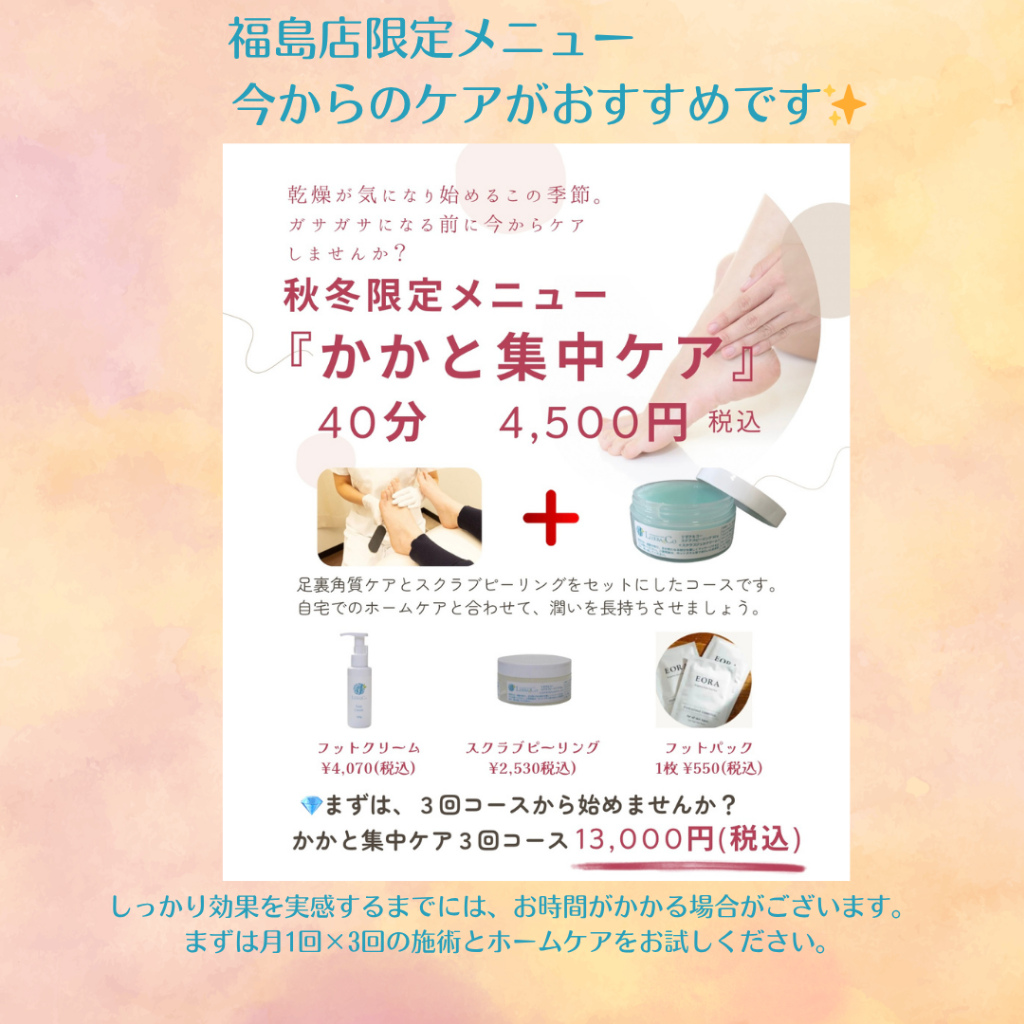 当サロンの3つのコースメニューには、それぞれフットバスとフットトリートメントが含まれています!